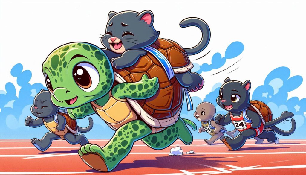 Langsam, aber stetig trug Leni Paula auf ihrem Rücken weiter, während die anderen Tiere sich verausgabten. Schließlich, nach langer Zeit, erreichten sie die Ziellinie. Die Menge jubelte, als sie sahen, wie Leni mit Paula ins Ziel kam.